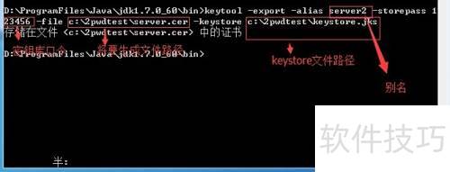 2、 在成功生成上述文件后,需执行 keytool -export -alias your_alias -storepass password -file server.cer -keystore keystore.jks 命令,以导出并创建名为 server.cer 的证书文件。该操作将从指定的密钥库中提取公钥证书,并保存为独立的文件,便于后续在其他系统或服务中进行信任配置和安全通信使用。