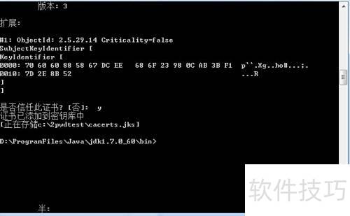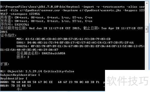 3、 操作成功后,可继续创建一个新的信任库文件,并将服务器证书导入其中。具体可通过执行 keytool 工具的导入命令实现:使用 -import 参数,配合 -v(显示详细信息)和 -trustcacerts(信任证书链)选项,指定别名为 your_alias,读取 server.cer 证书文件,目标密钥库设为 cacerts.jks,同时设置密钥密码和库密码均为 password。该命令会将证书安全地添加至信任库,完成配置后,系统即可信任该服务器证书,为后续安全通信奠定基础。整个过程需确保路径和密码正确,避免导入失败。