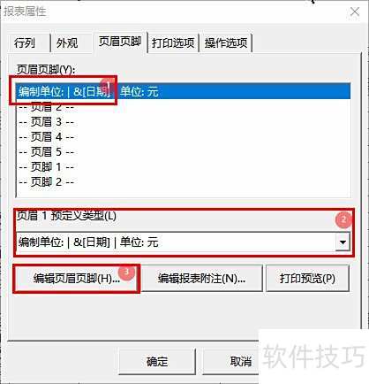 7、 页眉设置为:编制单位、日期及单位(元)的组合格式。