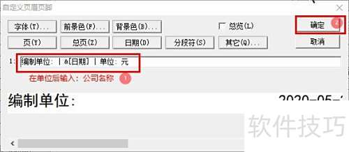 8、 在页眉页脚编辑界面的编制单位后输入公司名称,完成填写后点击确定按钮即可保存设置。