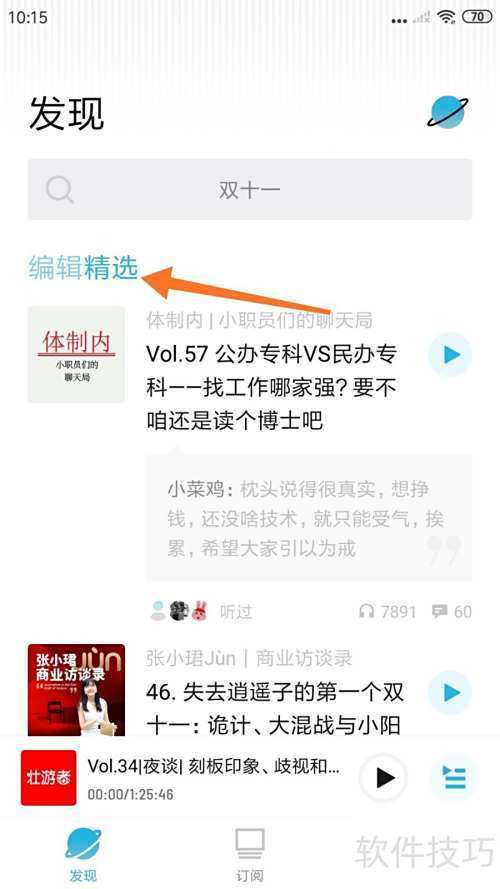 2、 进入发现页后,点击顶部的编辑精选进行设置。