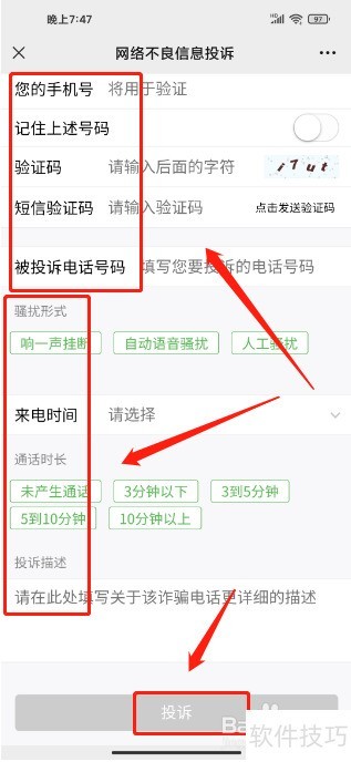 4、 进入投诉页面,填写投诉人信息、被投诉号码、骚扰方式、来电与通话时间及投诉详情后,点击投诉按钮提交。