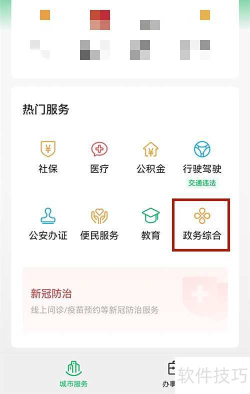 4、 进入城市服务,选择并点击政务综合选项。