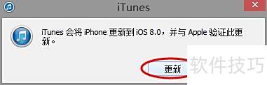 9、 打开后会显示iTunes将把iPhone升级至iOS 8.0,并与Apple验证此次更新,确认无误后点击更新继续操作。