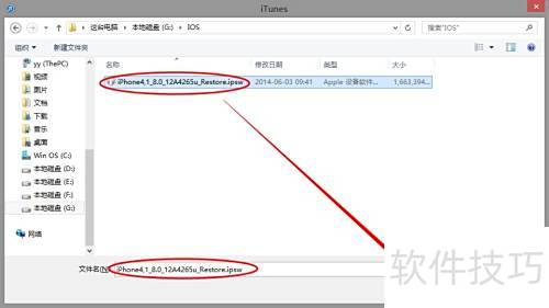 7、 随后将弹出打开文件对话框,找到已下载的固件文件(扩展名为.ipsw),选中并打开即可。