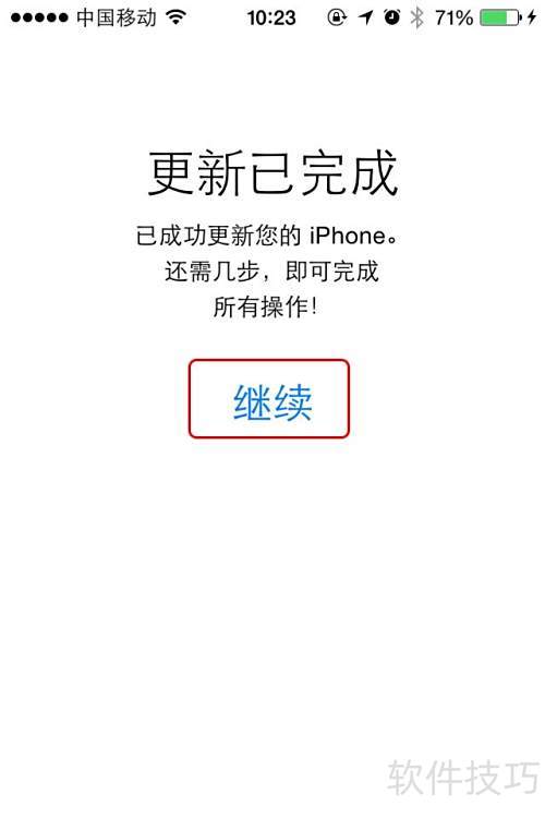 16、 更新完成提示出现后,点击继续按钮进入后续设置步骤。