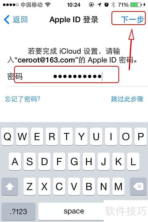 19、 请输入您的iCloud账号密码,完成后点击下一步,也可选择跳过此步骤。