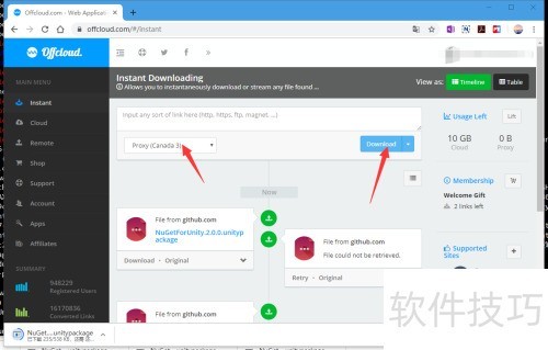 3、 将链接粘贴至offcloud个人中心的下载页面,选择服务器位置后点击下载即可。