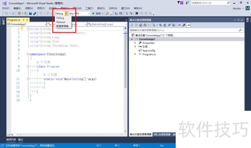 在Visual Studio中通过配置管理器切换Debug和Release模式。