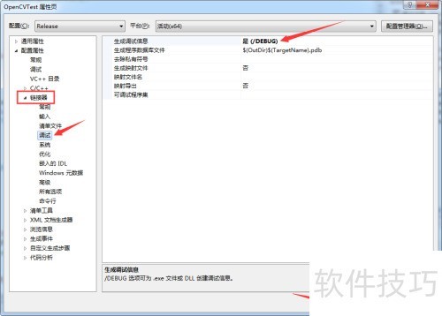 4、 点击左侧连接器中的调试选项,将调试信息设为是(/DEBUG),然后依次点击应用和确定按钮完成设置。