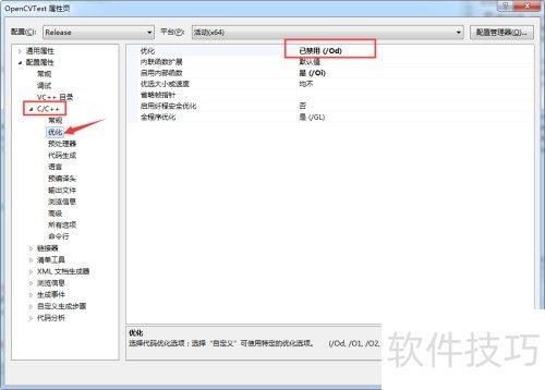 3、 在左侧选择C++,进入优化设置,将其改为已禁用(/Od),然后点击应用保存更改。