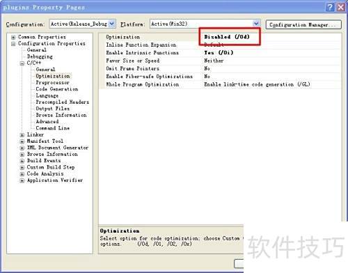 8、 将C/C++优化选项中的Optimization设置为禁用状态。