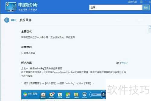 3、 在腾讯电脑管家中进入电脑门诊,通过搜索栏输入蓝屏字查找对应修复方案并点击执行。