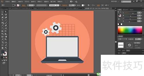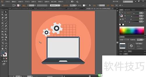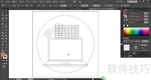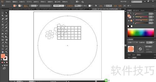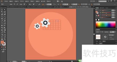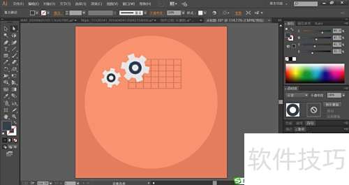 2、 先以红灰色填充内圆,再用暗红灰填充外矩形,接着用钢笔绘制齿轮,最后以矩形工具勾勒出格子路径。