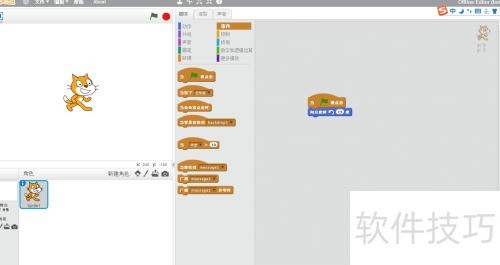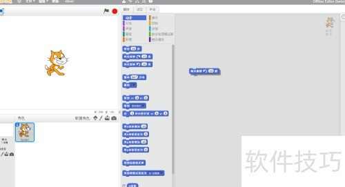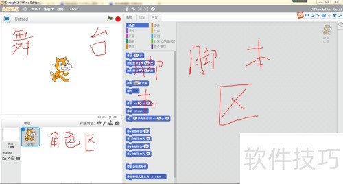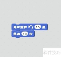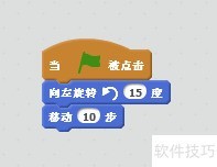 3、 接下来需了解各脚本的具体含义,例如移动十步表示角色在X轴方向前进10个单位,旋转15度指以角色中心为轴顺时针转动15度。