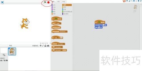 5、 点击角色栏中的绿旗按钮,脚本随即启动,角色将按预设脚本发生变化。图一为绿旗位置,图二为点击前状态,图三为点击后效果。