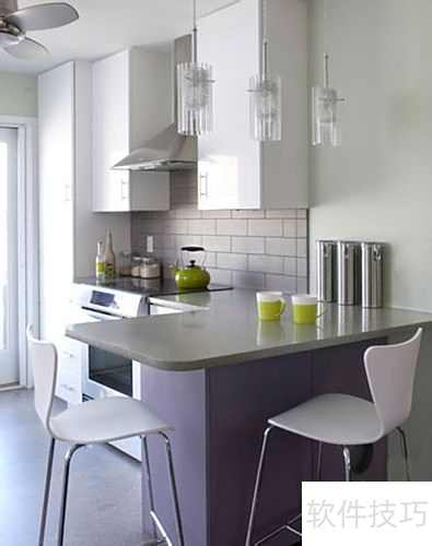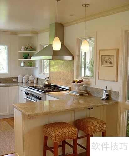 1、 半开放式厨房兼顾独立性与开阔感,整体以白色为主,点缀蓝色装饰画与地毯,显得清爽明亮。两侧墙壁上方对称设置顶柜,紧邻窗户收纳碗碟,巧妙利用垂直空间。操作台一侧以木板向外延伸,形成垂直台面,搭配两把座椅,轻松营造出简约实用的用餐区域,功能与美感兼具。