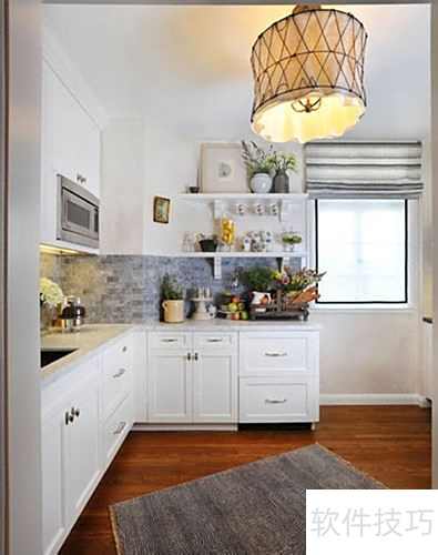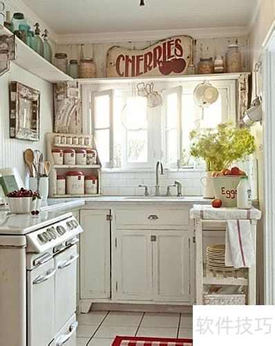 13、 白色橱柜与红色小物件相映成趣,为小厨房增添甜美气息。做旧木家具、红格地毯与嫩绿盆栽共同营造出清新浪漫的田园风格。巧妙的收纳设计令人称道,橱柜旁设有置物架,墙角上方安装转角搁板,各类瓶罐干货整齐陈列,实用又美观。