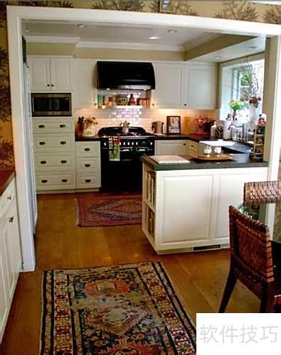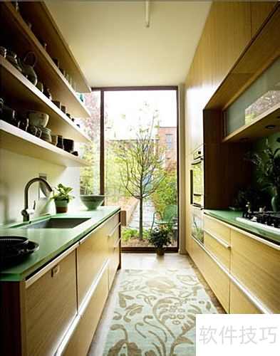 12、 狭长厨房两侧设置操作台,巧妙实现干湿分区,绿与木色相配,营造自然韵味,地面铺上花纹地毯,既呵护双脚,又增添美观,空间实用与美感兼具。