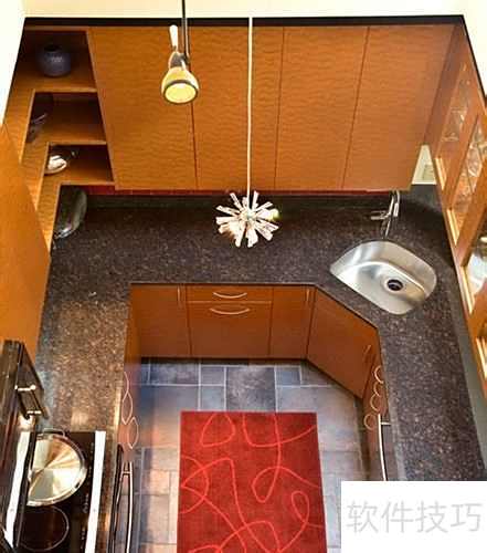 14、 俯视视角清晰展现厨房布局,木色整体橱柜充满空间,U型操作台转角巧妙设计,嵌入水槽,充分利用每一寸区域,布局合理,视觉通透,功能与美观兼具,彰显匠心独运的空间规划。