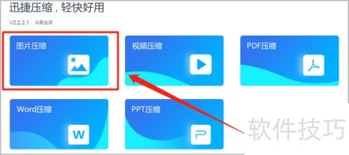 2、 启动电脑上已安装的压缩工具,界面显示五项功能:图片、视频、PDF、Word和PPT压缩。选择其中的图片压缩选项,即可进入下一操作步骤,方便快捷地进行文件处理。