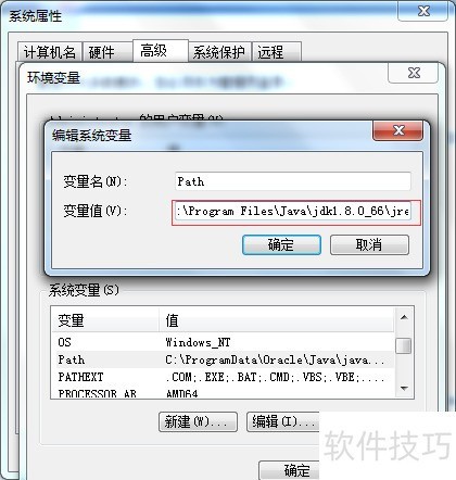7、 接下来需要配置path环境变量,该变量系统中已存在,无需新建。操作时保持原有内容不变,仅在末尾追加新的路径即可。需添加的路径包括Java安装目录下的bin文件夹路径,以及jre目录中的bin路径。例如,若JDK安装在C:Program FilesJavajdk1.8.0_66目录下,则应添加C:Program FilesJavajdk1.8.0_66in和C:Program FilesJavajdk1.8.0_66jrein两个路径,注意用英文分号与其他路径隔开,确保系统能正确识别Java命令。