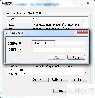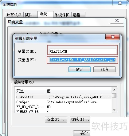 6、 在弹出的对话框中,进入系统变量设置并点击新建按钮,创建一个名为 CLASSPATH 的新变量。完成变量名输入后,开始配置其对应值。注意,在填写变量值时,开头必须添加英文半角的.;,以确保当前目录被正确识别。随后,将 Java 安装路径下 lib 文件夹中的 dt.jar 和 tools.jar 文件路径一并加入。路径之间需用英文分号隔开。例如,若 Java 安装在 C 盘的Program FilesJavajdk1.8.0_66目录下,则完整配置应为:.;C:Program FilesJavajdk1.8.0_66libdt.jar;C:Program FilesJavajdk1.8.0_66lib ools.jar。确保路径准确无误,避免因格式或字符错误导致配置失败。