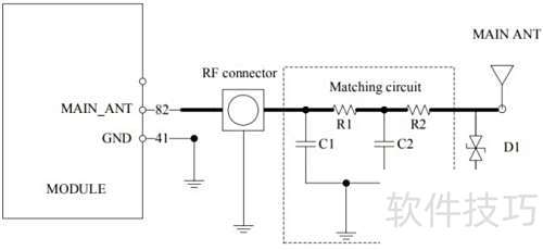 3、 在上述设计中,通过R1、C1、C2和R2四个元件实现天线的阻抗匹配,其具体参数值需在完成天线调谐后确定,通常由天线厂商提供。默认情况下,R1和R2使用0Ω电阻,C1和C2预留用于后期调节。D1为ESD保护器件,用户可根据实际使用环境自行选型。射频测试接口应靠近模块的MAIN_ANT引脚布置,以便进行射频性能检测。此外,模块与天线之间的传输路径需严格控制为50Ω特性阻抗,以确保信号传输效率和整体射频性能的稳定性。