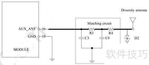 4、 图中辅助天线的匹配电路由R3、C3、C4和R4组成。默认配置下,R3与R4使用0Ω电阻,C3和C4预留用于调试优化。D2为TVS二极管,提供ESD保护,用户可根据实际应用环境自行选型。