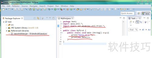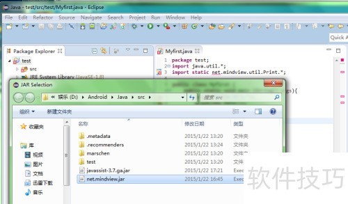 3、 在工程名上点击右键,选择构建路径,添加外部归档文件,然后选中并导入net.mindview.jar即可完成操作。