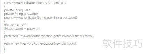 2、 创建一个认证凭证类,继承自Authenticator抽象类,重写并实现其getPasswordAuthentication方法,用于返回密码认证信息。
