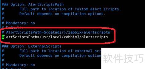 4、 修改Zabbix服务器配置文件,指定报警脚本存放路径。打开zabbix_server.conf文件,定位到AlertScriptsPath参数(在Zabbix 3.0.2版本中位于第448行),将其值更改为所需的脚本目录路径,确保Zabbix服务能正确调用报警脚本。保存后重启服务使配置生效。