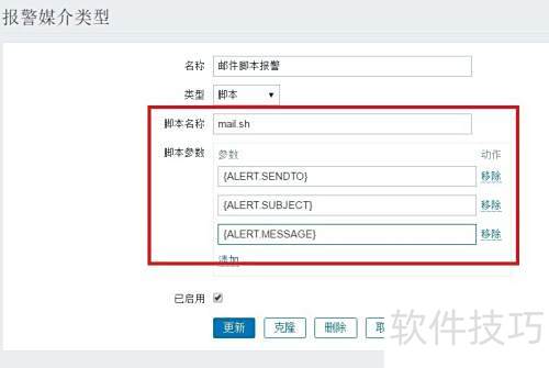 23、 进入创建页面,输入名称邮件报警脚本,类型选择脚本,脚本名称选择mail.sh。随后点击添加按钮,依次添加三个参数:{ALERT.SENDTO}、{ALERT.SUBJECT} 和 {ALERT.MESSAGE},分别对应 mail.sh 脚本中的收件人(to)、主题(subject)和正文(body)。参数设置完毕后,点击页面下方的更新按钮,完成配置。至此,邮件报警媒介已成功创建,可投入使用。