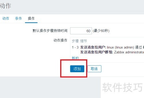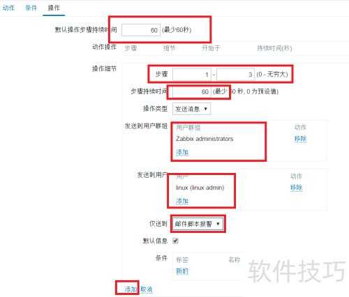 26、 在动作配置页面的名称栏中输入预设的动作名称,并勾选恢复通知选项,确保系统恢复正常时也能发送邮件提醒。接着在条件设置中添加触发警报的规则,此处设定为当被监控设备发生严重故障或更高级别异常时才触发报警。进入操作配置界面后,保持默认步骤执行时长为60秒,共设置三个步骤,每个步骤持续60秒。接收对象选择Zabbix administrator用户组,并指定此前已关联报警媒介的Linux用户,通知方式限定为邮件脚本告警。完成配置后,点击添加按钮保存该动作,系统将按设定执行报警流程。