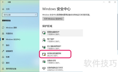9、 在Windows安全中心右侧窗口,找到应用和浏览器控制(建议操作),点击进入应用和浏览器控制设置界面。