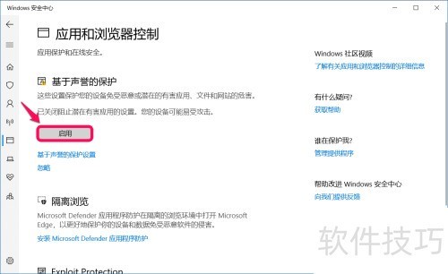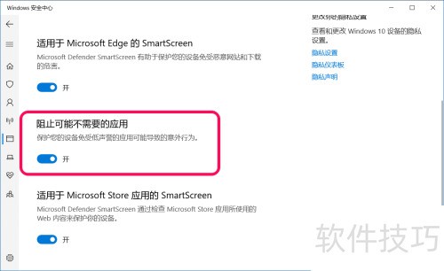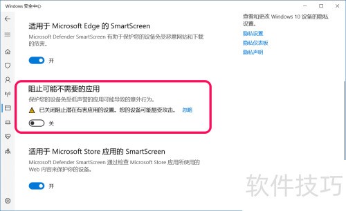 13、 将开关设为状态,可防止低信誉应用引发异常操作,随后退出Windows安全中心界面。