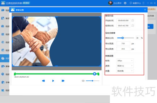 2、 将视频文件导入转换页面后,点击参数设置即可打开裁剪窗口。在此可调整起始时间、终止时间、画面宽高、比例缩放及播放速度。完成各项参数设置后,点击添加到列表并确认,即可将裁剪后的片段保存至任务列表中,准备进行下一步转换操作。