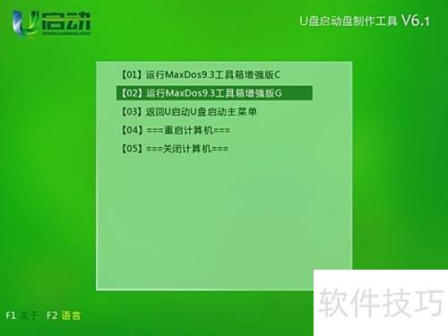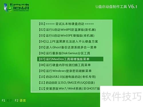 1、 准备一个u启动U盘启动盘,将其插入电脑的USB接口。重启计算机,当屏幕显示开机画面时,立即按下快捷键进入u启动主菜单。在菜单中选择运行MaxDOS工具箱增强版,随后敲击回车键确认操作,即可进入相应功能界面,具体操作所示。