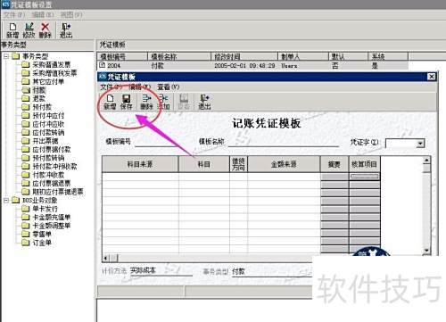 47、 保存按钮位于新窗口记账凭证模板的左上角,请注意查看。