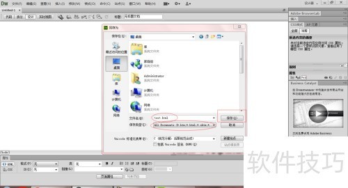 5、 新建一个HTML标准格式的网页文件,系统默认命名为untitled1.html。选择文件菜单中的另存为选项,弹出保存对话框后,将文件名更改为test.html,保存类型选择All Documents,对应扩展名包括.html等。设置完成后,点击保存按钮,即可将文件按指定名称和格式存储到目标位置,完成操作。