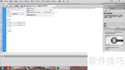 7、 编写代码后,点击工具栏中的预览或调试按钮,即可在Dreamweaver默认浏览器中查看页面运行效果,实时检验设计与功能的实现情况。