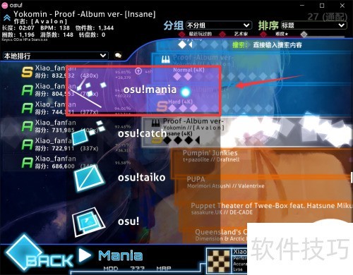 6、 选择已下载的谱面并搭配喜欢的皮肤即可开始游戏。想要精通mania模式,关键在于坚持练习,多挑战高难度谱面,避免跨级游玩,循序渐进地提升节奏感与操作精准度,持续积累经验才能稳步进步。