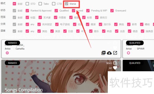 2、 若想体验Mania模式的谱面,可前往Sayobot镜像站进行下载。该站点支持按游戏模式筛选,推荐选择已评级的谱面,因这类谱面通常可计算pp,更适合追求成绩与挑战的玩家。