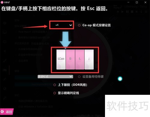 4、 进入键位设置界面后,可选择适合自己的mania键位数量,并对具体按键进行个性化调整。