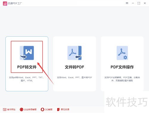 1、 首先启动电脑,运行优速PDF工厂1.2.0软件,进入主界面后选择功能,进入操作页面,即可开始对PDF文件进行格式转换处理。