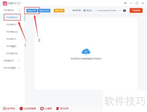 2、 进入软件内页后,选择功能,点击或按钮,导入需转换的PDF文件,支持批量导入与批量转换,操作便捷高效。