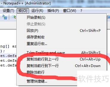 5、 设置将当前行复制到下一行的宏操作大体类似。首先将光标定位到目标行,随后进入菜单栏选择宏→开始录制。接着按下Ctrl+D(默认快捷键,尚未修改),此时当前行已被复制;再按向下方向键,将光标移至下一行。随后通过鼠标点击宏菜单,选择停止录制,完成宏的录制过程。录制完成后,将该宏保存,并为其分配一个快捷键,例如设置为Ctrl+Alt+Down。同理,若要实现复制当前行到上一行的功能,可在录制宏时在复制后按向上方向键,并将快捷键设为Ctrl+Alt+Up。两项宏命令设置完毕后,即可快速实现上下行复制。此外,还可参考相关教程配置删除当前行的宏功能。全部设置完成后,点击宏菜单,即可在列表中看到已保存的各项自定义宏命令,使用时直接调用对应快捷键即可,大幅提升编辑效率,使日常代码操作更加便捷流畅。