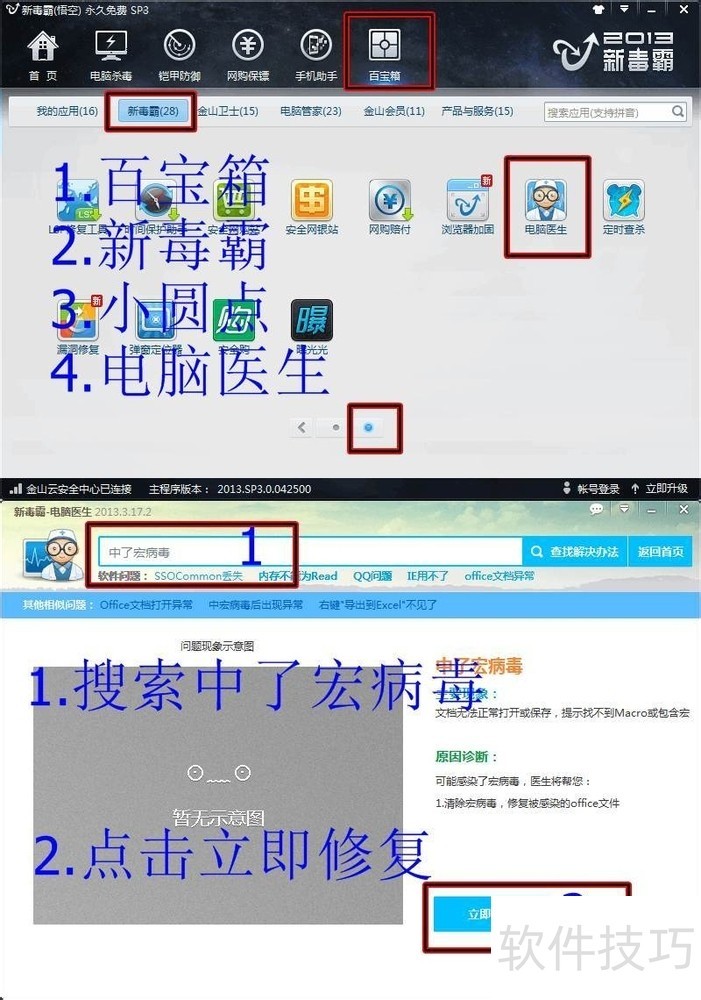 6、 杀毒软件中的电脑医生可一键修复宏病毒问题,自动完成系统修复操作,保障电脑安全稳定运行。