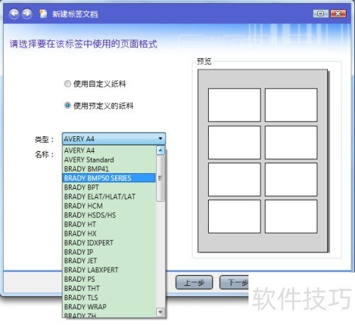 3、 请在此界面选择标签所用的页面格式,可选使用自定义纸料或使用预定义纸料,然后点击下一步。系统提供多种预设页面格式,方便您根据需求灵活选择,提升操作效率。