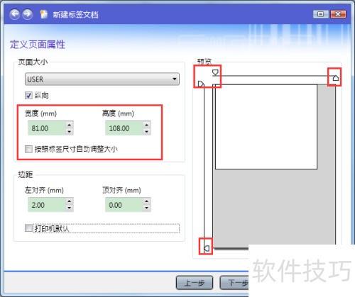 5、 进入定义页面属性界面后,可根据需要自定义设置页面的高度与宽度。您既可在输入框中直接设定数值,也可通过拖动右侧预览图中的箭头符号来调整页面尺寸,操作灵活便捷。设置完成后,点击下一步继续操作。